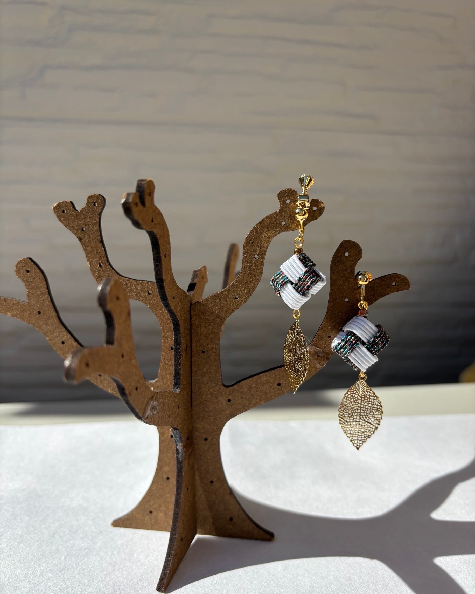 白と銀の水引をあわじ結びに。金の葉をあしらった、特別な日のための耳飾り。